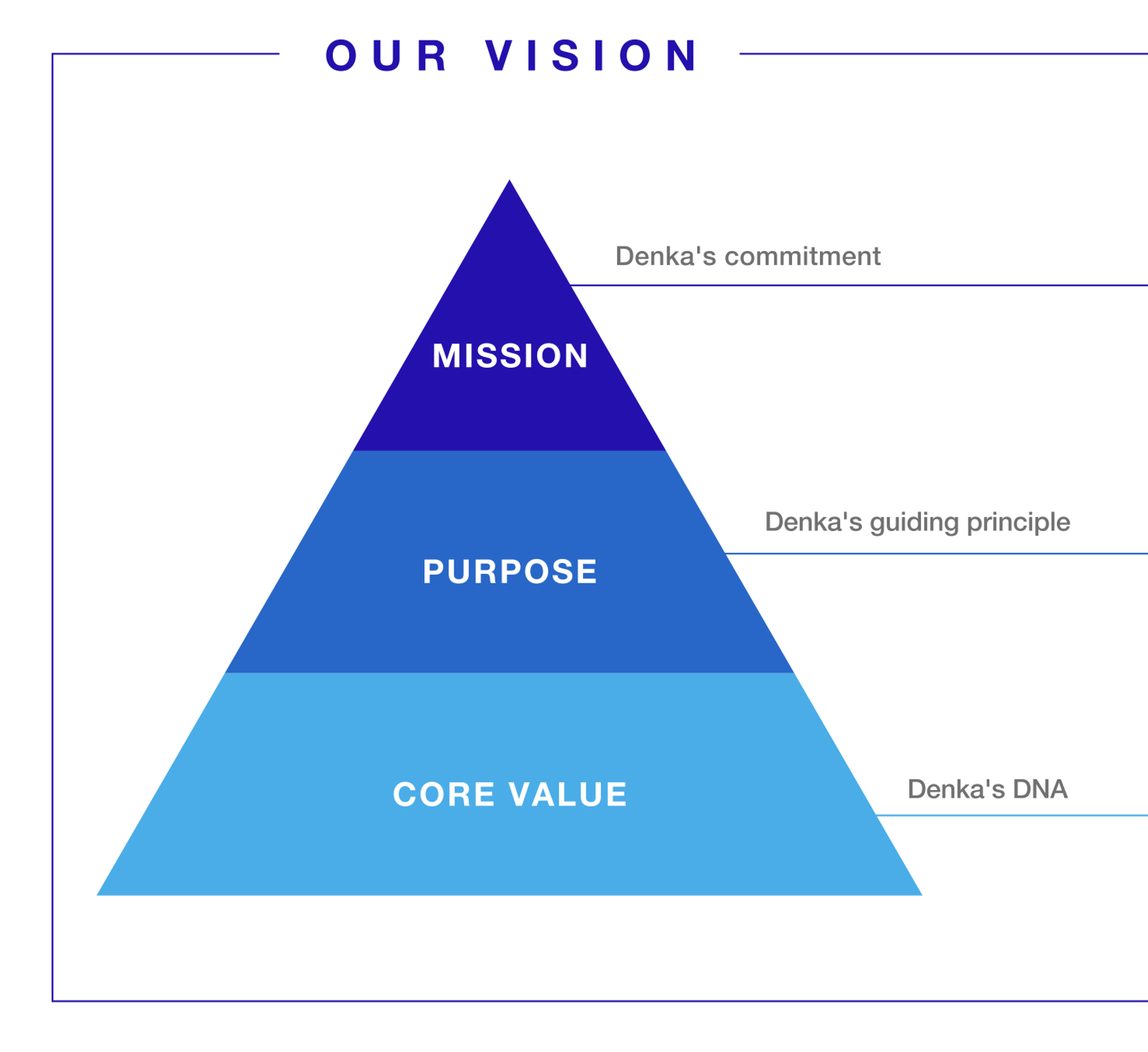 2023년, Denka는 2030년까지의 8년을 대상으로 한 비전과 경영계획 **「Mission2030」**을 수립하며 새로운 발걸음을 내디뎠습니다.**“2030년까지 인재와 경영 가치를 높이고, 스페셜티·메가트렌드·지속가능성의 3요소를 갖춘 사업 가치 창출에 집중한다.”**라는 미션 아래, 사업·인재·경영의 세 가지 가치를 창조합니다.이를 통해 Denka의 기업 가치를 높이고 존재 의의를 명확히 하며, Denka의 DNA인 **‘도전’, ‘성실’, ‘공감’**의 자세로 내일의 Denka를 만들어갑니다.