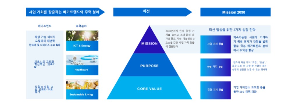비전은 앞으로 예상되는 세계를 분석하고, 그로부터 새로운 사업 기회를 창출하는 메가트렌드와 중점 분야를 기반으로 구축되었습니다.비전의 실행 목표인 미션을 달성하기 위해, 당사는 사업 가치, 인재 가치, 경영 가치라는 세 가지 가치 창조를 통해 성장 전략을 추진하고, 기업 가치 향상으로 이어가겠습니다.